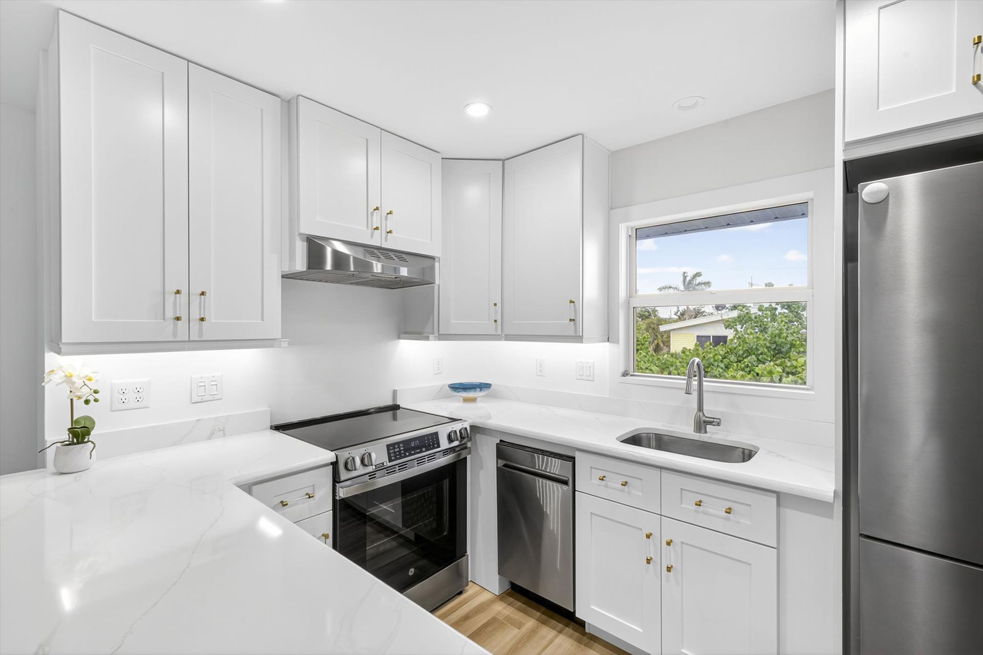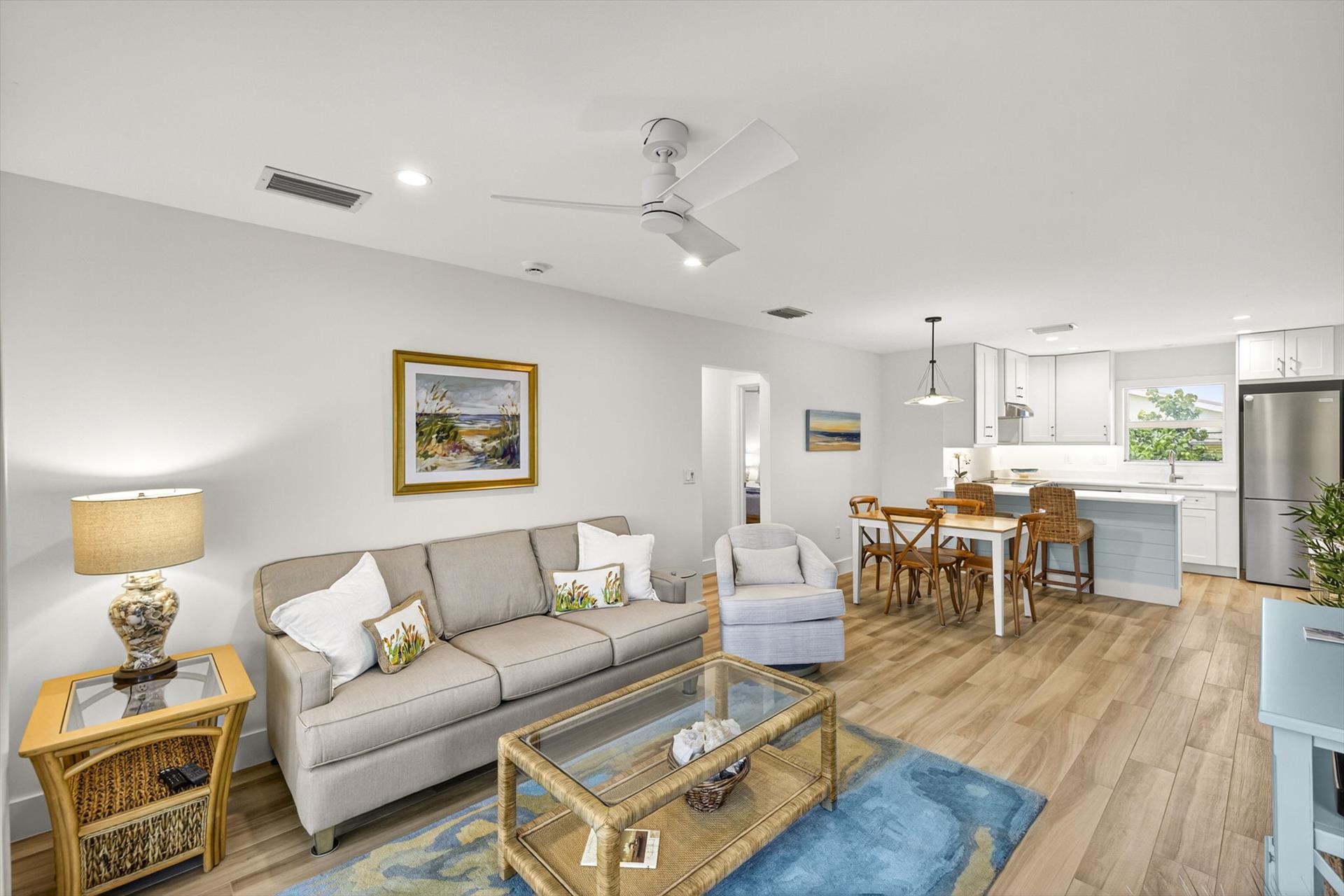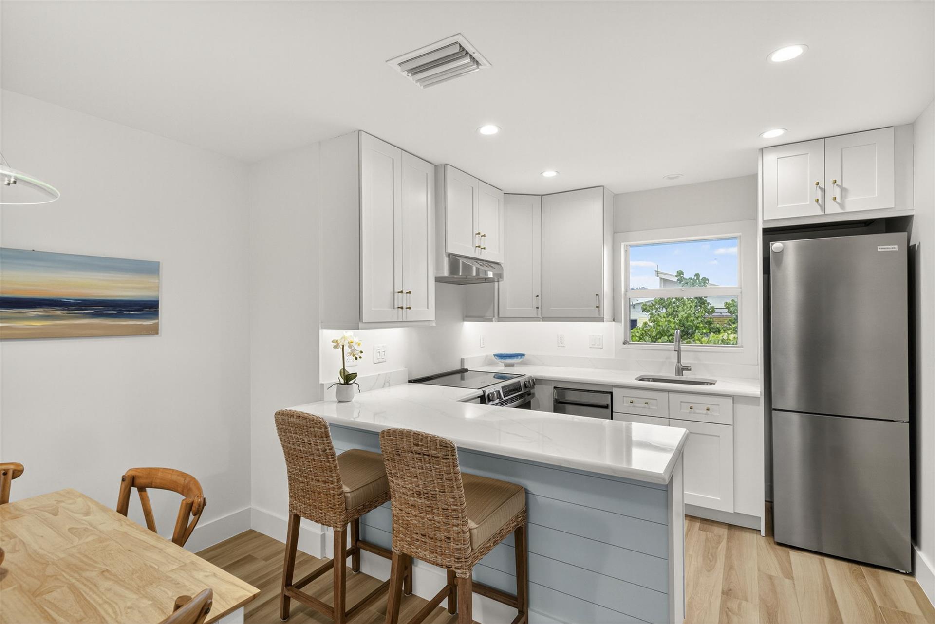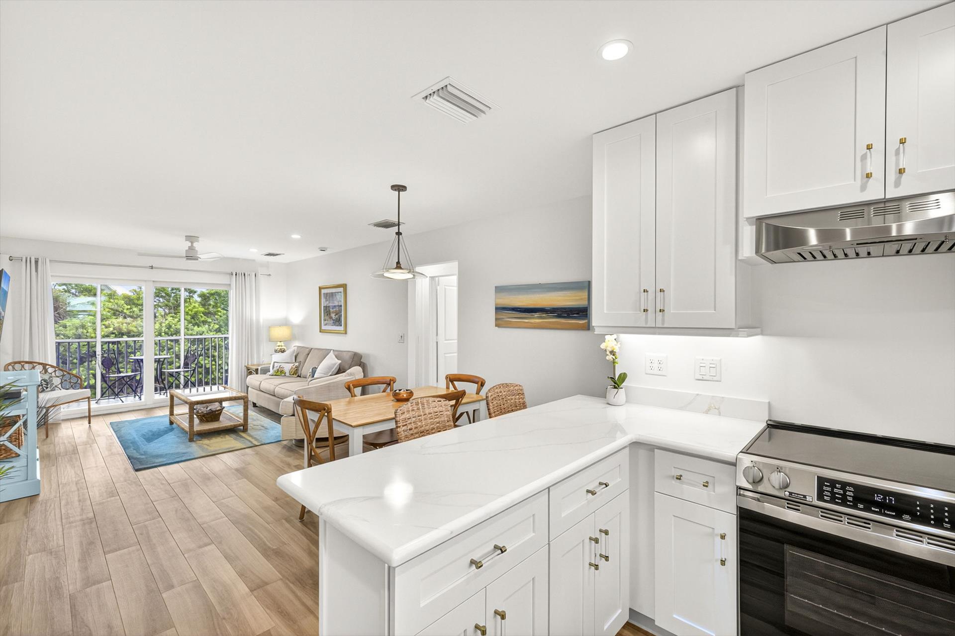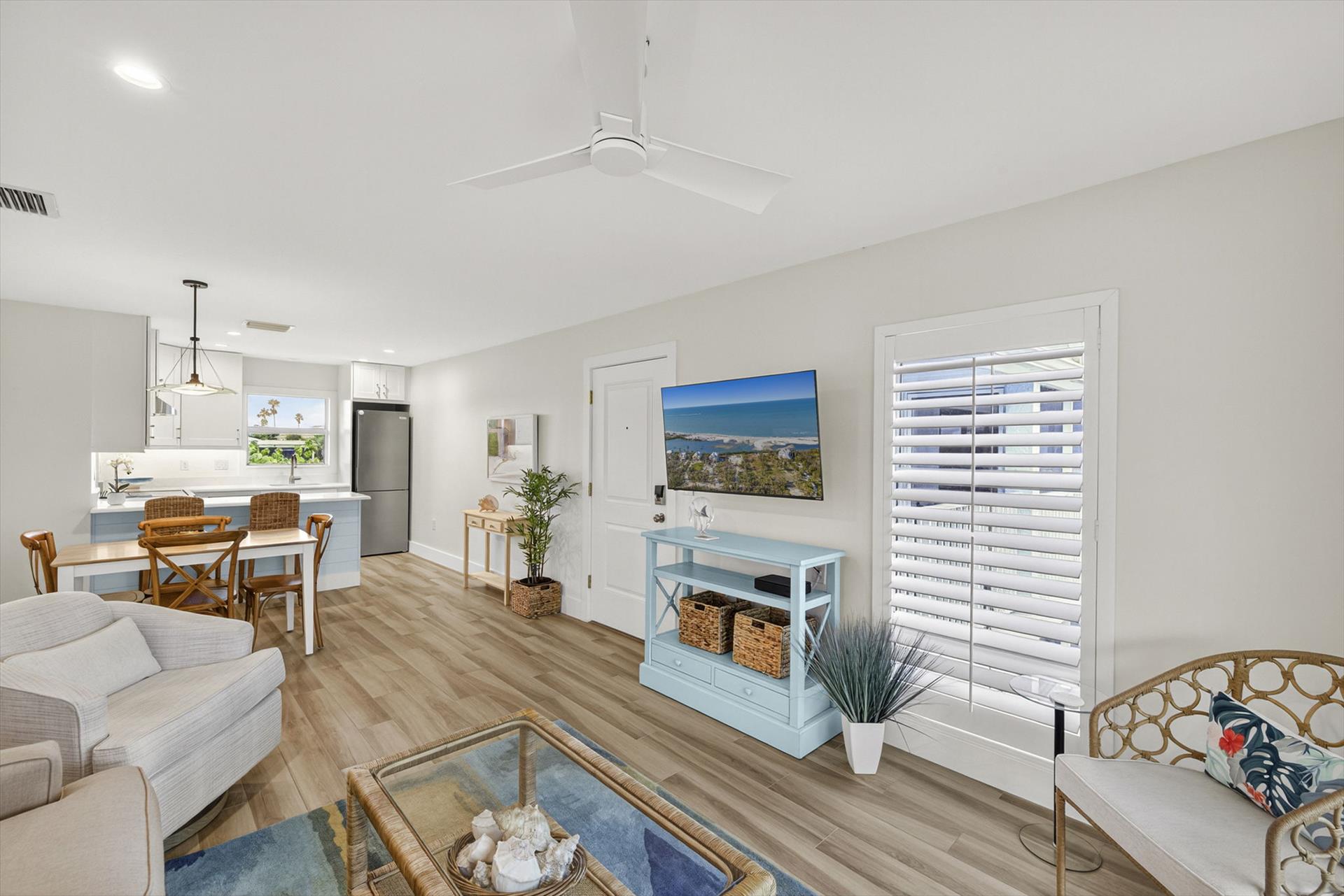 Unit 34 is ALL NEW. Enjoy an inviting open floor plan with 2BRs-2 baths plus a fully equipped Quartz Kitchen w/breakfast bar with seating. The spacious living rm offers a large smart TV and is open to the dining room. Sliders open to a screened lanai for your morning sunrise.
